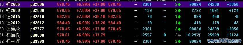 午后,钯金主力期货也紧紧封住涨停,报578.45元/克,大涨7%,截止收盘,钯金主力期货钯金2606以及2608、2610、2612合约也全部涨停。钯金期货上市20交游日从377元/克一起大涨至578.45元/克,高潮进取53%。