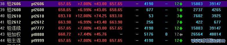 12月24日,在外洋黄金、白银价钱接连刷新历史记载的刺激下,广期所上市交游的铂金期货、钯金期货全部涨停。铂金主力期货在开盘历程换手之后,便紧紧封住涨停,大涨7%,报657.65元/克,走出惊东谈主的三连板行情,截止收盘,铂金2606、2608、2610、2612合约全部涨停,其中铂金2606、2608、2612合约大涨7%,2610合约大涨12%。自11月27日上市以来,在短短20个交游日中,铂金大涨49.13%,区间最大涨幅进取54%。