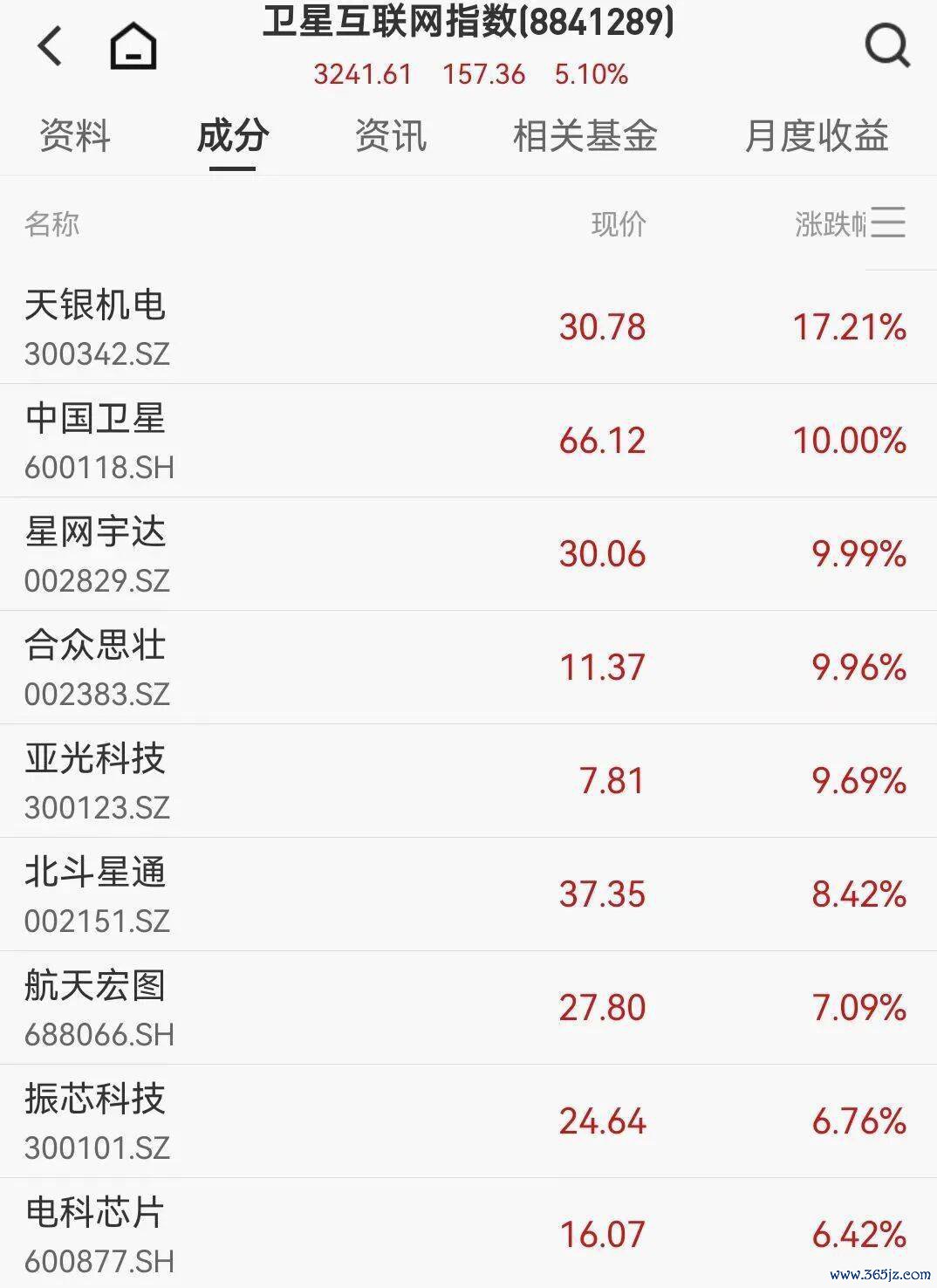 10万亿超等赛说念爆发,超20股集体涨停戒指收盘,卫星互联网看法指数涨幅超5%。中国卫星、航天能源、新劲刚、超捷股份、新雷能、有研粉材等多股20CM涨停;九转换材、天通股份、中超控股等20余股涨停,天银机电涨幅超17%。